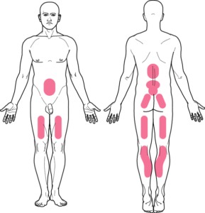 Potential pain sites associated with abdominal aortic aneurysm. Back pain is present in around 50% of pre-rupture aneurysms. Buttock and thigh symptoms may be referred from the vessel itself. Calf pain may be a result of distal embolization.
