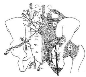 Needle Location used for injection of the sacroiiac ligaments. Trigger point of ligaments: (IL) Iliolumbar; (LS) Lumbosacral-supra and interspinus; (A,B,C,D,) Posterior sacroiliac; (SS) Sacroapinus; (ST) Sacrotuberus;(SC) Sacrococcygeal;(H) Hip-Articular; (SN) Sciatic nerve (from G.S. Hackett, Ligament and Tendon Relaxation. Charles C. Thomas Co., 1958)