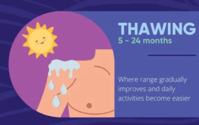 The thawing stage represents a phase of gradual improvement in shoulder mobility. While the exact mechanisms underlying this stage are not fully understood, it is believed that the gradual breakdown of adhesions and collagen deposition leads to increased flexibility.