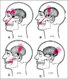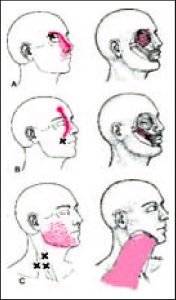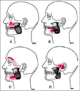 The Masseter muscles are involved in chewing and jaw movements. Trigger points in these muscles can lead to jaw, face, and neck pain, which may extend to the shoulder area.Referred pain pattern from the rhomboid (A), levator scapulae (B), trapezius (C), iliocostalis thoracic (D), scalene (E), and infraspinatus (F) muscles