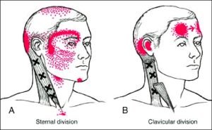 The Sternocleidomastoid (SCM) muscles are involved in neck rotation and flexion. Trigger points in these muscles are often associated with headaches and neck pain. Left SCM trigger points may cause pain radiating towards the left shoulder, while Right SCM trigger points can lead to pain in the right shoulder.